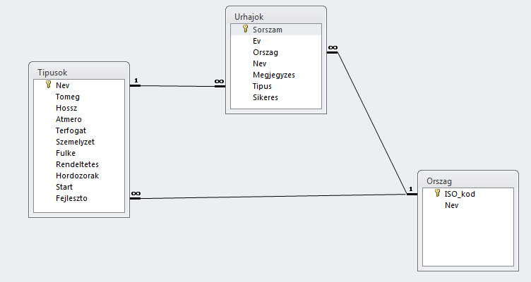13. ábra: Az Űrhajók adatbázis táblái között lévő kapcsolatok