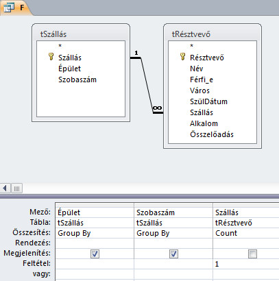 21. ábra: A Jelentkezési adatbázis című feladat F részfeladatának megoldása tervező nézetben