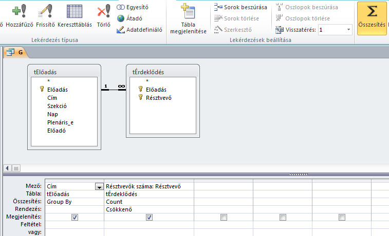 24. ábra: A Jelentkezési adatbázis című feladat G részfeladatának megoldása tervező nézetben