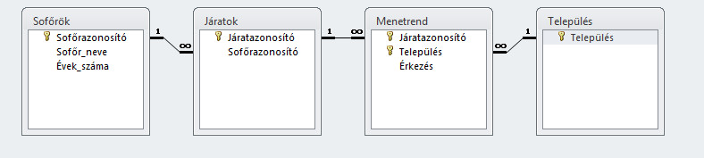 9. ábra: A jaratok adatbázis táblái és a köztük lévő kapcsolatok