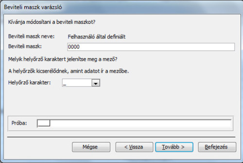- A Beviteli maszk sorban jelenleg ez szerepel: 0000/00/00. Az első négy 0 kivételével töröljünk ki mindent, majd kattintsunk a Próba sorba, majd kattintsunk a Tovább gombra, végül pedig a Befejezés gombra!