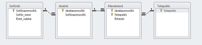 A legkönnyebb dolgunk a Sofor.txt, a Jarat.txt és a menet0.txt állományokkal lesz, hiszen az ezekben szereplő adatok fogják adni a Sofőrök, a Járatok és a Települések táblák adatait. A Településeknek azért célszerű külön táblába kerülniük, mert a feladat is kiemelte, hogy ezeknek a listája folyamatosan bővülhet, így, ha külön táblában vannak eltárolva, akkor biztosíthatjuk azt, hogy csak azokat a településeket használhassuk fel a menetrendben, melyek szerepelnek a Települések táblában is (emlékezz az anomáliákra).