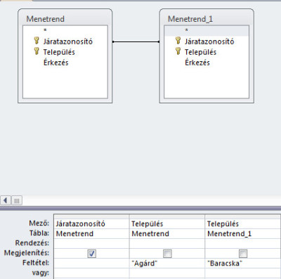 - Írjuk be a Menetrend tábla Feltétel sorába azt, hogy Agárd, a Menetrend_1 tábláéba pedig azt, hogy Baracska. Váltsunk át Adatlap nézetre!
