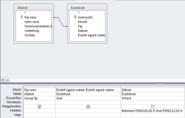 - Jelenítsük meg az Állatok táblából a Faj neve, az Észlelések táblából pedig az Észlelt egyed száma és a Dátum mezőket! Egyúttal a Dátum mezőre fogalmazzuk meg a feltételünket: Between #2010.01.01.# And #2010.12.31.#.