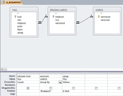 - Mivel létszámot kell számolnunk, ezért szükségünk lesz a Tag táblára. Ezen kívül szükség lesz a Varos táblára is, hiszen a lekérdezés eredményében csak a budapesti tagoknak kell szerepelniük. Ahhoz azonban, hogy a már beállított kapcsolat e két tábla között a lekérdezésben is érvényesüljön, hozzá kell még adnunk a lekérdezéshez az Irszam_varos nevű kapcsolótáblát is.
