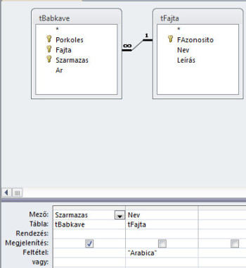 - Jelenítsük meg az allekérdezés végeredményében a tBabkave tábla Szarmazas mezőjét és a tFajta tábla Nev mezőjét! Ez utóbbi mező feltételéhez írjuk be, hogy Arabica! Mivel csak a származási azonosítókra van szükségünk, ezért szedjük ki a Nev mező Megjelenítés sorából a pipát! Most az alábbi képet kell látnunk: