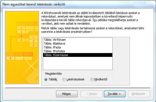 - A felugró ablakban válasszuk ki a Nem egyezőket kereső lekérdezés varázslót, majd kattintsunk a Tovább gombra!