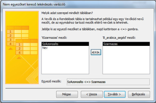 - A következő lépésben össze kell kapcsolnunk a két objektumot. Ezt az összekapcsolást a tSzarmazas tábla SzAzonosíto és a B_arabica_segéd lekérdezés Szarmazas mezőin keresztül tudjuk megvalósítani, hiszen ezek a mezők tartalmazzák a származási helyek azonosítóit. Jelöljük ki mindkét mezőt, majd kattintsunk a <=> gombra! Így a két mező megjelent az Egyező mezők sorban. Ha megvagyunk, kattintsunk a Tovább gombra!