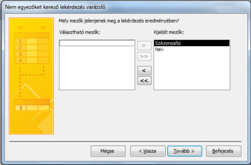 - Az utolsó előtti lépésben azt kell eldöntenünk, hogy a lekérdezés végeredményében mely mezők jelenjenek meg. Mivel a származási helyekre vagyunk kíváncsiak, ezért mind a Nev, mind a SzAzonosíto mezők megjelenhetnek a lekérdezés végeredményében. Adjuk hozzá őket a kijelölt mezőkhöz, majd kattintsunk a Tovább gombra!