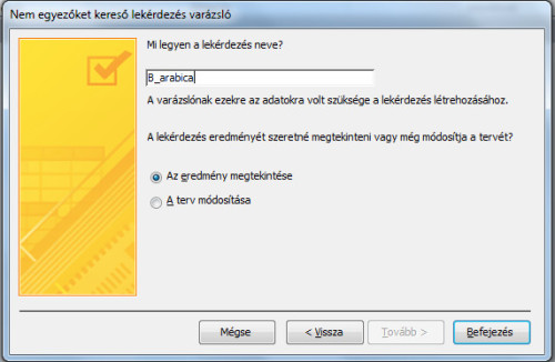 - Az utolsó lépésben el kell neveznünk a lekérdezést. Legyen a neve B_arabica! Miután begépeltük, kattintsunk a Befejezés gombra, és tekintsük meg munkánk végeredményét!